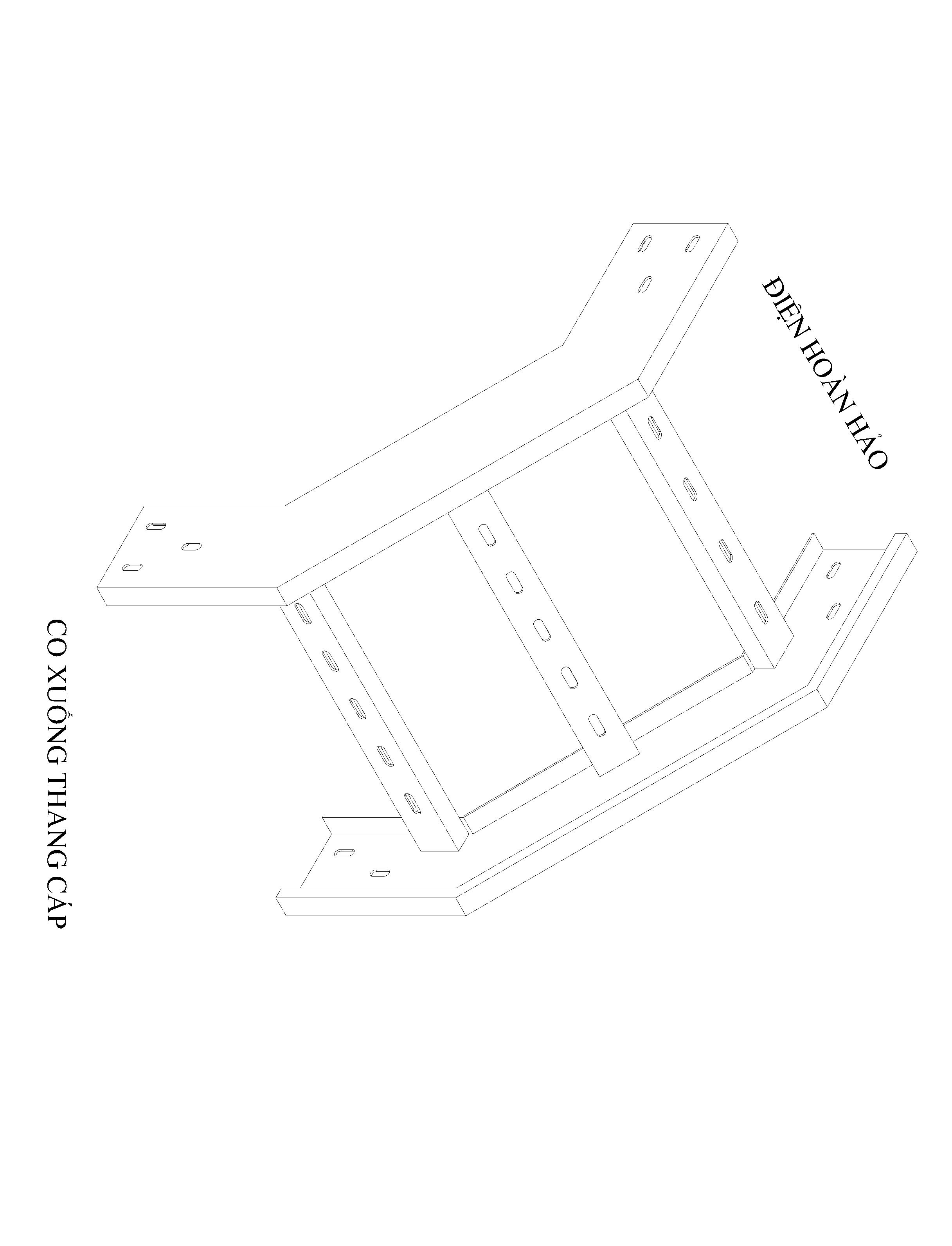 Co xuống thang cáp cấu tạo bới hai cây rail, các góc 45độ thanh rail được dập trên máy đột CNC hoặc máy cắt Laser, hai cây rail được liên kết với nhau bới những cây thanh chia được chấn chữ C chắc chắn có chiều dài tương ứng chiều rộng kích thước thang, được hàn lại mối hàn míc bền đẹp, khoản cách giữa các cây thanh chia d=315mm.