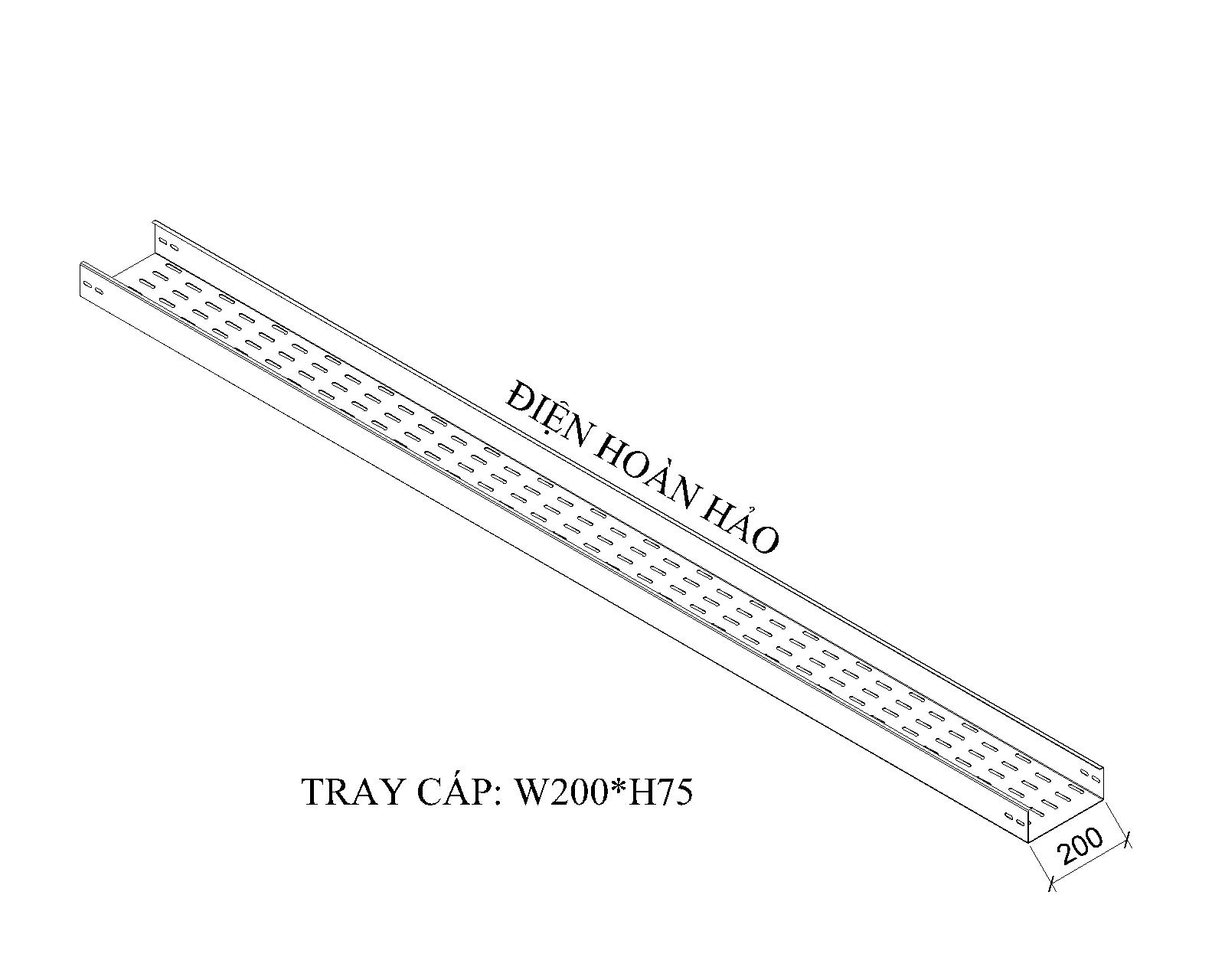 Khay cáp W200*H75 cấu tạo bởi theo hình chữ C, chiều rộng W=200mm và chiều cao H=75mm, sản xuất trên thép tấm được cắt theo kích thước phù hợp, sử dụng máy chấn chuyện dụng chấn vuông góc, sản xuất theo yêu cầu của chủ đầu tư, tư vấn thiết kế hoặc đơn vị thi công, mặt dưới đấy được dập lỗ Ovan giảm tản nhiệt làm mát cáp điện đồng thời hàng lỗ bố trí thẩm mỹ, mặt bên hông được dập lỗ điểm đầu và điểm cuối máng mục đích gắng bát nối và liên kết các cây máng lại với nhau, canh trên máng cạnh chấn thường chấn cạnh 10 đến 12mm dùng tăng cứng cây máng đồng thời gắng nắp máng giữ cố định.
