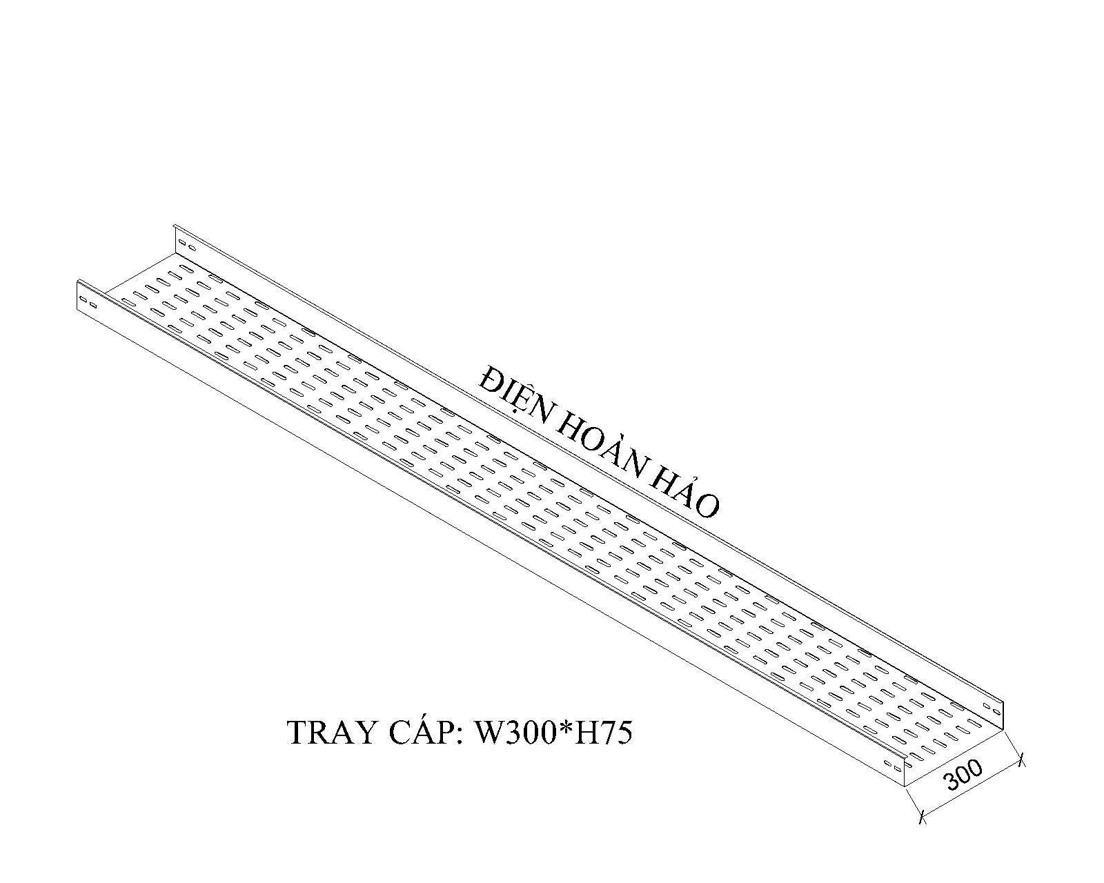 Khay cáp W300*H75 cấu tạo bởi theo hình chữ C, chiều rộng W=300mm và chiều cao H=75mm, sản xuất trên thép tấm được cắt theo kích thước phù hợp, sử dụng máy chấn chuyện dụng chấn vuông góc, sản xuất theo yêu cầu của chủ đầu tư, tư vấn thiết kế hoặc đơn vị thi công, mặt dưới đấy được dập lỗ Ovan giảm tản nhiệt làm mát cáp điện đồng thời hàng lỗ bố trí thẩm mỹ, mặt bên hông được dập lỗ điểm đầu và điểm cuối máng mục đích gắng bát nối và liên kết các cây máng lại với nhau, canh trên máng cạnh chấn thường chấn cạnh 10 đến 12mm dùng tăng cứng cây máng đồng thời gắng nắp máng giữ cố định.