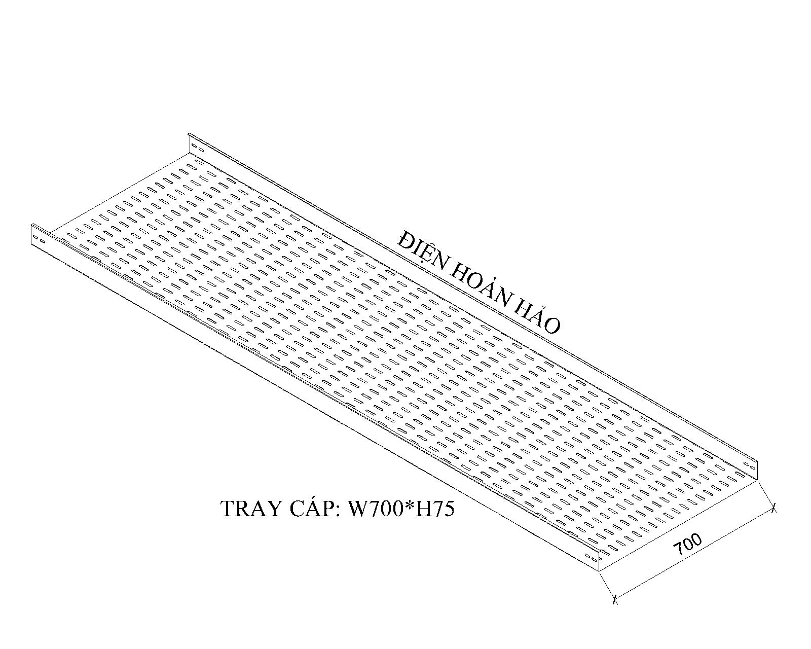 Khay cáp W700*H75 cấu tạo bởi theo hình chữ C, chiều rộng W=700mm và chiều cao H=75mm, sản xuất trên thép tấm được cắt theo kích thước phù hợp, sử dụng máy chấn chuyện dụng chấn vuông góc, sản xuất theo yêu cầu của chủ đầu tư, tư vấn thiết kế hoặc đơn vị thi công, mặt dưới đấy được dập lỗ Ovan giảm tản nhiệt làm mát cáp điện đồng thời hàng lỗ bố trí thẩm mỹ, mặt bên hông được dập lỗ điểm đầu và điểm cuối máng mục đích gắng bát nối và liên kết các cây máng lại với nhau, canh trên máng cạnh chấn thường chấn cạnh 10 đến 12mm dùng tăng cứng cây máng đồng thời gắng nắp máng giữ cố định.