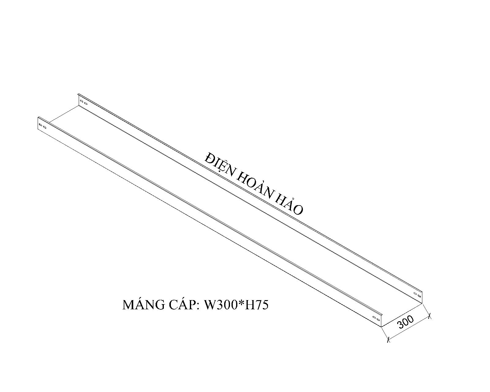 Máng cáp W300*H75 cấu tạo bởi theo hình chữ C, chiều rộng W=300mm và chiều cao H=75mm, sản xuất trên thép tấm được cắt theo kích thước phù hợp, sử dụng máy chấn chuyện dụng chấn vuông góc, sản xuất theo yêu cầu của chủ đầu tư, tư vấn thiết kế hoặc đơn vị thi công, mặt bên hông được dập lỗ điểm đầu và điểm cuối máng mục đích gắng bát nối và liên kết các cây máng lại với nhau, canh trên máng cạnh chấn thường chấn cạnh 10 đến 12mm dùng tăng cứng cây máng đồng thời gắng nắp máng giữ cố định.