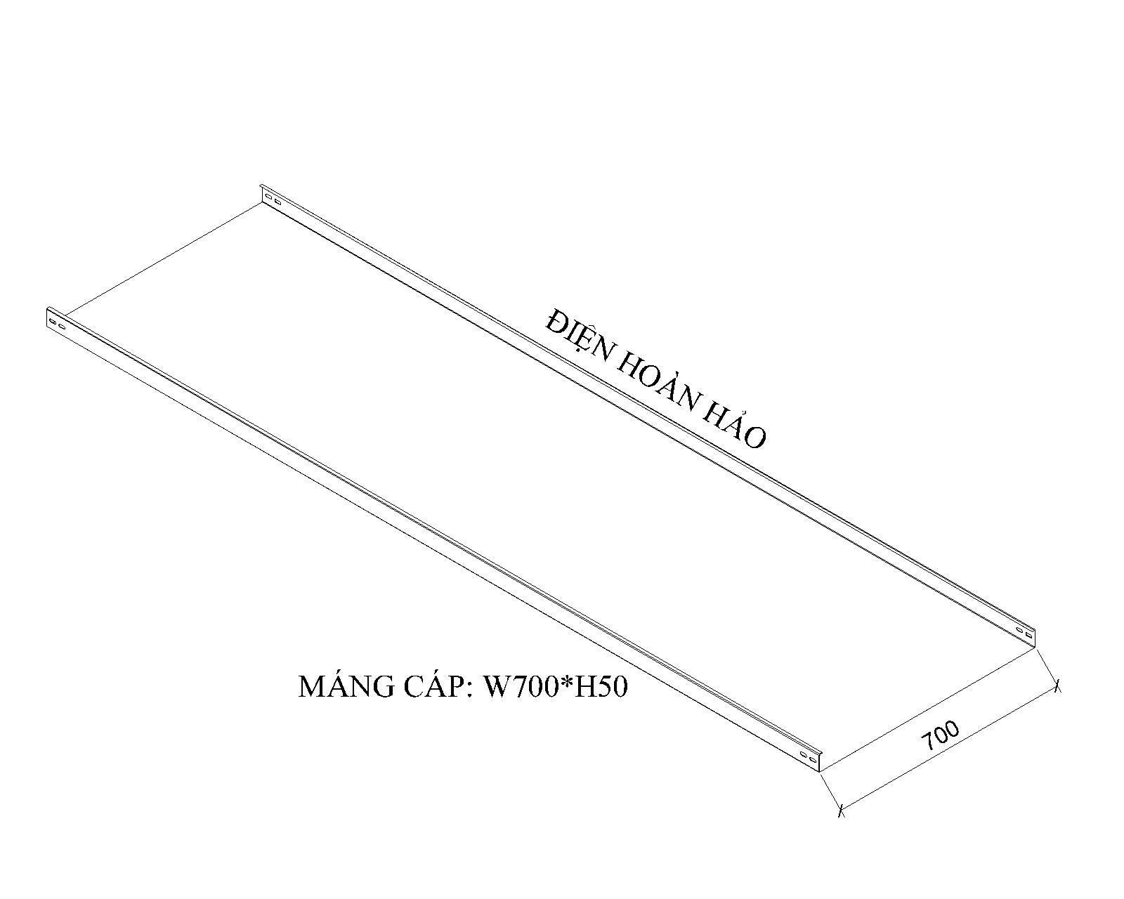 Máng cáp W700*H50 cấu tạo bởi theo hình chữ C, chiều rộng W=700mm và chiều cao H=50mm, sản xuất trên thép tấm được cắt theo kích thước phù hợp, sử dụng máy chấn chuyện dụng chấn vuông góc, sản xuất theo yêu cầu của chủ đầu tư, tư vấn thiết kế hoặc đơn vị thi công, mặt bên hông được dập lỗ điểm đầu và điểm cuối máng mục đích gắng bát nối và liên kết các cây máng lại với nhau, canh trên máng cạnh chấn thường chấn cạnh 10 đến 12mm dùng tăng cứng cây máng đồng thời gắng nắp máng giữ cố định.