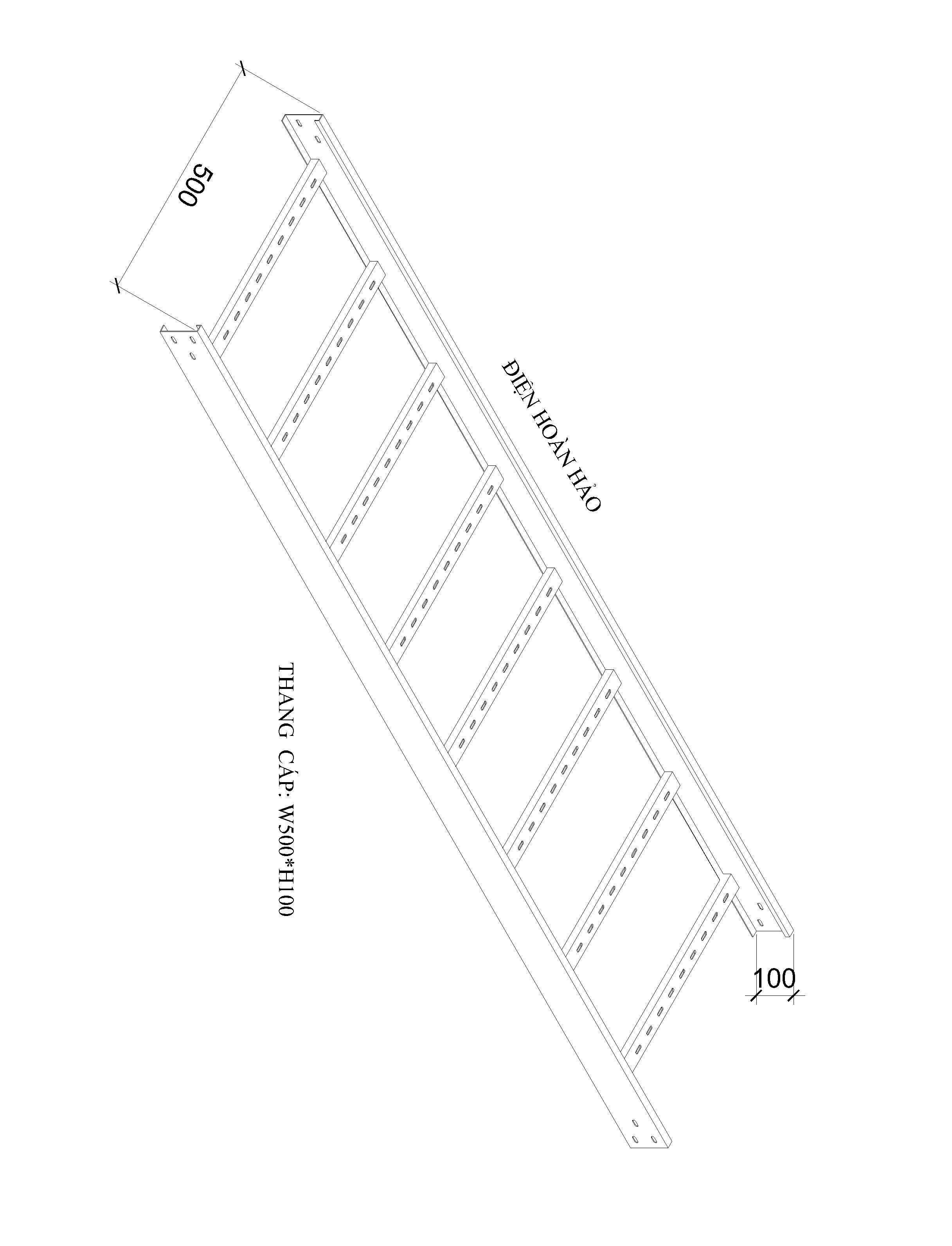 Thang cáp W500*H100 cấu tạo bới hai cây rail có chiều cao H100 và chiều dài L=2500mm, hai cây rail được liên kết với nhau bới những cây thanh chia được chấn chữ C chắc chắn có chiều dài W500, được hàn lại mối hàn míc bền đẹp, khoản cách giữa các cây thanh chia d=315mm.
