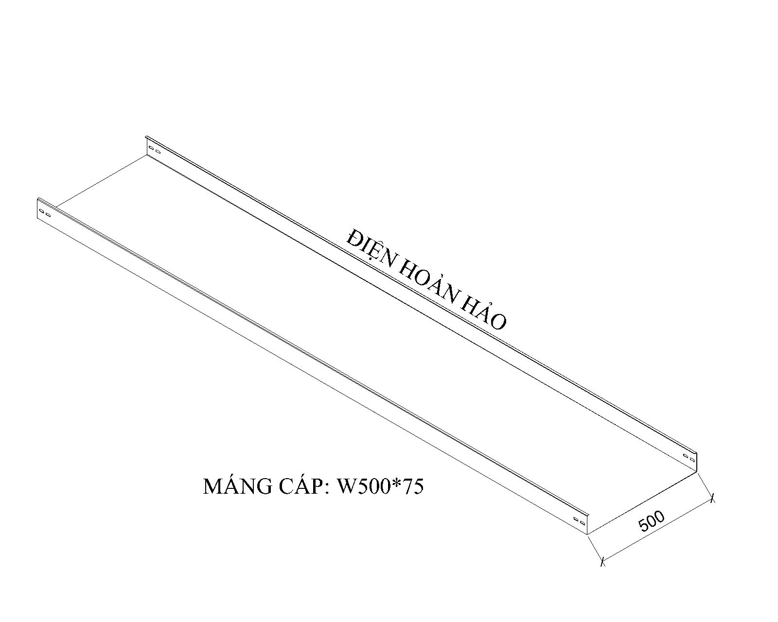 Máng cáp W500*H75 cấu tạo bởi theo hình chữ C, chiều rộng W=500mm và chiều cao H=75mm, sản xuất trên thép tấm được cắt theo kích thước phù hợp, sử dụng máy chấn chuyện dụng chấn vuông góc, sản xuất theo yêu cầu của chủ đầu tư, tư vấn thiết kế hoặc đơn vị thi công, mặt bên hông được dập lỗ điểm đầu và điểm cuối máng mục đích gắng bát nối và liên kết các cây máng lại với nhau, canh trên máng cạnh chấn thường chấn cạnh 10 đến 12mm dùng tăng cứng cây máng đồng thời gắng nắp máng giữ cố định.