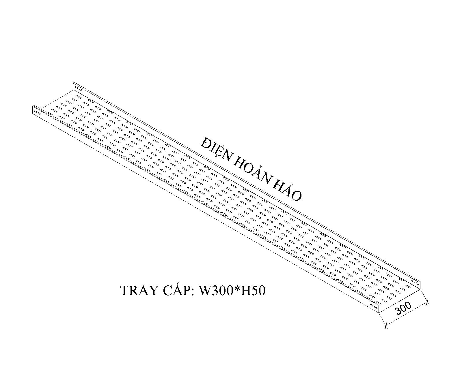 Khay cáp W300*H50 cấu tạo bởi theo hình chữ C, chiều rộng W=300mm và chiều cao H=50mm, sản xuất trên thép tấm được cắt theo kích thước phù hợp, sử dụng máy chấn chuyện dụng chấn vuông góc, sản xuất theo yêu cầu của chủ đầu tư, tư vấn thiết kế hoặc đơn vị thi công, mặt dưới đấy được dập lỗ Ovan giảm tản nhiệt làm mát cáp điện đồng thời hàng lỗ bố trí thẩm mỹ, mặt bên hông được dập lỗ điểm đầu và điểm cuối máng mục đích gắng bát nối và liên kết các cây máng lại với nhau, canh trên máng cạnh chấn thường chấn cạnh 10 đến 12mm dùng tăng cứng cây máng đồng thời gắng nắp máng giữ cố định.