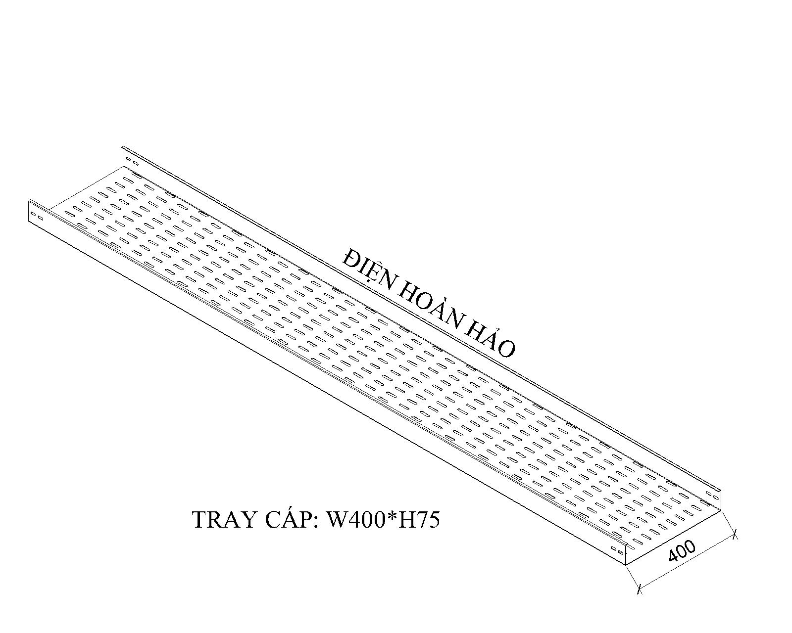 Khay cáp W400*H75 cấu tạo bởi theo hình chữ C, chiều rộng W=400mm và chiều cao H=75mm, sản xuất trên thép tấm được cắt theo kích thước phù hợp, sử dụng máy chấn chuyện dụng chấn vuông góc, sản xuất theo yêu cầu của chủ đầu tư, tư vấn thiết kế hoặc đơn vị thi công, mặt dưới đấy được dập lỗ Ovan giảm tản nhiệt làm mát cáp điện đồng thời hàng lỗ bố trí thẩm mỹ, mặt bên hông được dập lỗ điểm đầu và điểm cuối máng mục đích gắng bát nối và liên kết các cây máng lại với nhau, canh trên máng cạnh chấn thường chấn cạnh 10 đến 12mm dùng tăng cứng cây máng đồng thời gắng nắp máng giữ cố định.