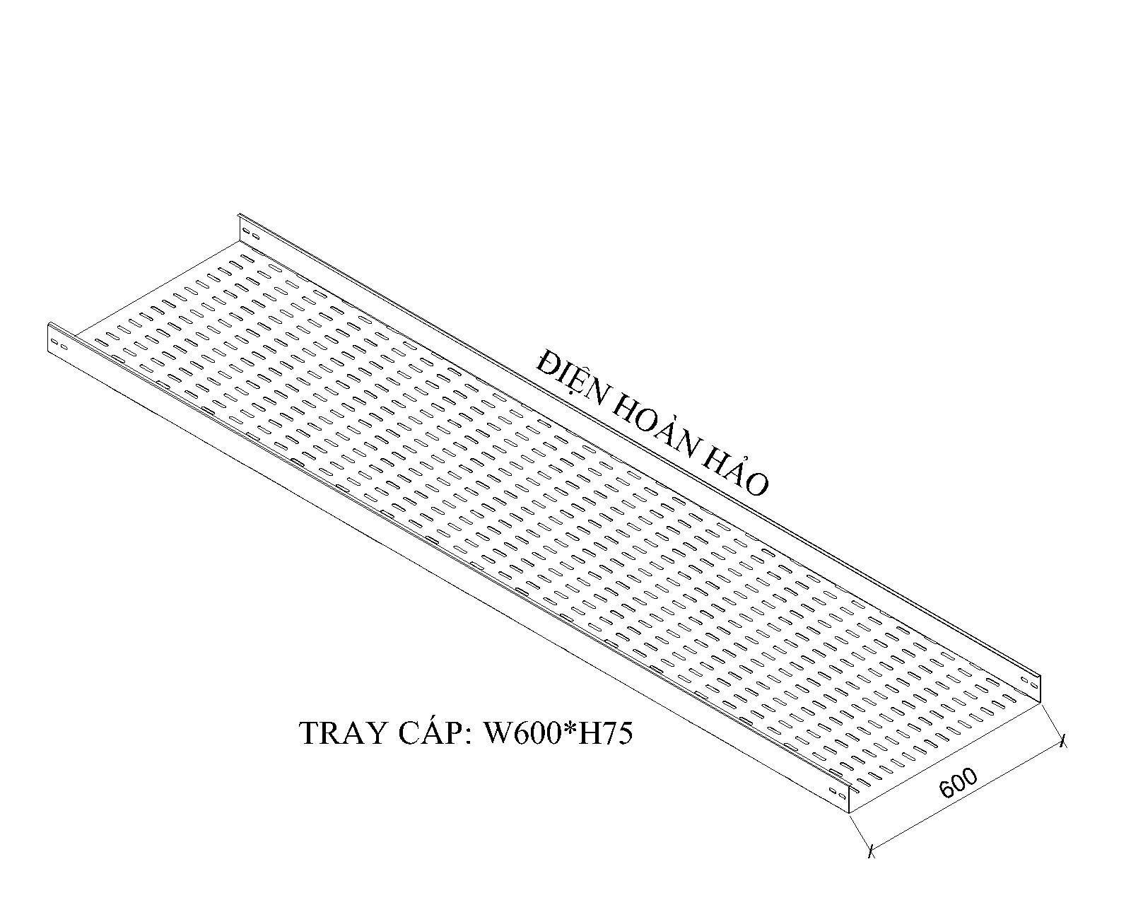 Khay cáp W600*H75 cấu tạo bởi theo hình chữ C, chiều rộng W=600mm và chiều cao H=75mm, sản xuất trên thép tấm được cắt theo kích thước phù hợp, sử dụng máy chấn chuyện dụng chấn vuông góc, sản xuất theo yêu cầu của chủ đầu tư, tư vấn thiết kế hoặc đơn vị thi công, mặt dưới đấy được dập lỗ Ovan giảm tản nhiệt làm mát cáp điện đồng thời hàng lỗ bố trí thẩm mỹ, mặt bên hông được dập lỗ điểm đầu và điểm cuối máng mục đích gắng bát nối và liên kết các cây máng lại với nhau, canh trên máng cạnh chấn thường chấn cạnh 10 đến 12mm dùng tăng cứng cây máng đồng thời gắng nắp máng giữ cố định.