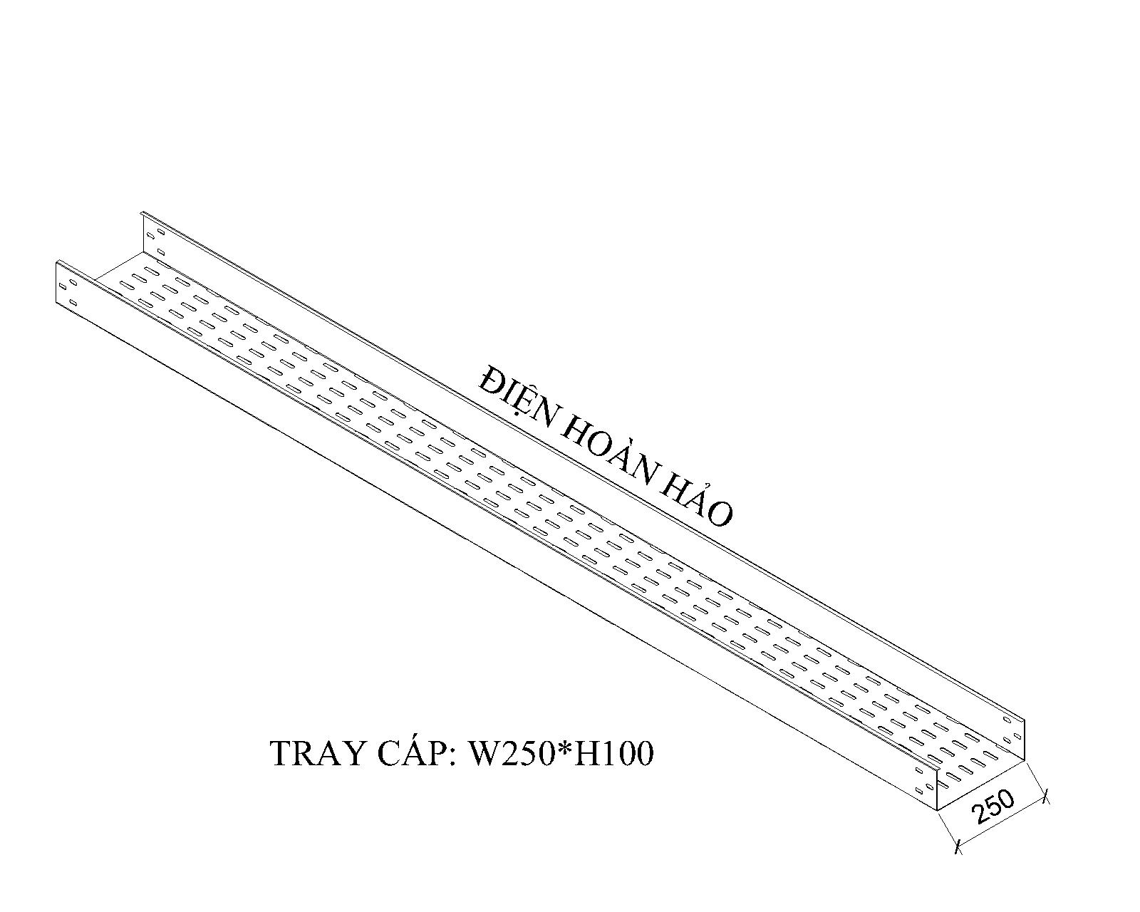 Khay cáp W250*H100 cấu tạo bởi theo hình chữ C, chiều rộng W=250mm và chiều cao H=100mm, sản xuất trên thép tấm được cắt theo kích thước phù hợp, sử dụng máy chấn chuyện dụng chấn vuông góc, sản xuất theo yêu cầu của chủ đầu tư, tư vấn thiết kế hoặc đơn vị thi công, mặt dưới đấy được dập lỗ Ovan giảm tản nhiệt làm mát cáp điện đồng thời hàng lỗ bố trí thẩm mỹ, mặt bên hông được dập lỗ điểm đầu và điểm cuối máng mục đích gắng bát nối và liên kết các cây máng lại với nhau, canh trên máng cạnh chấn thường chấn cạnh 10 đến 12mm dùng tăng cứng cây máng đồng thời gắng nắp máng giữ cố định.