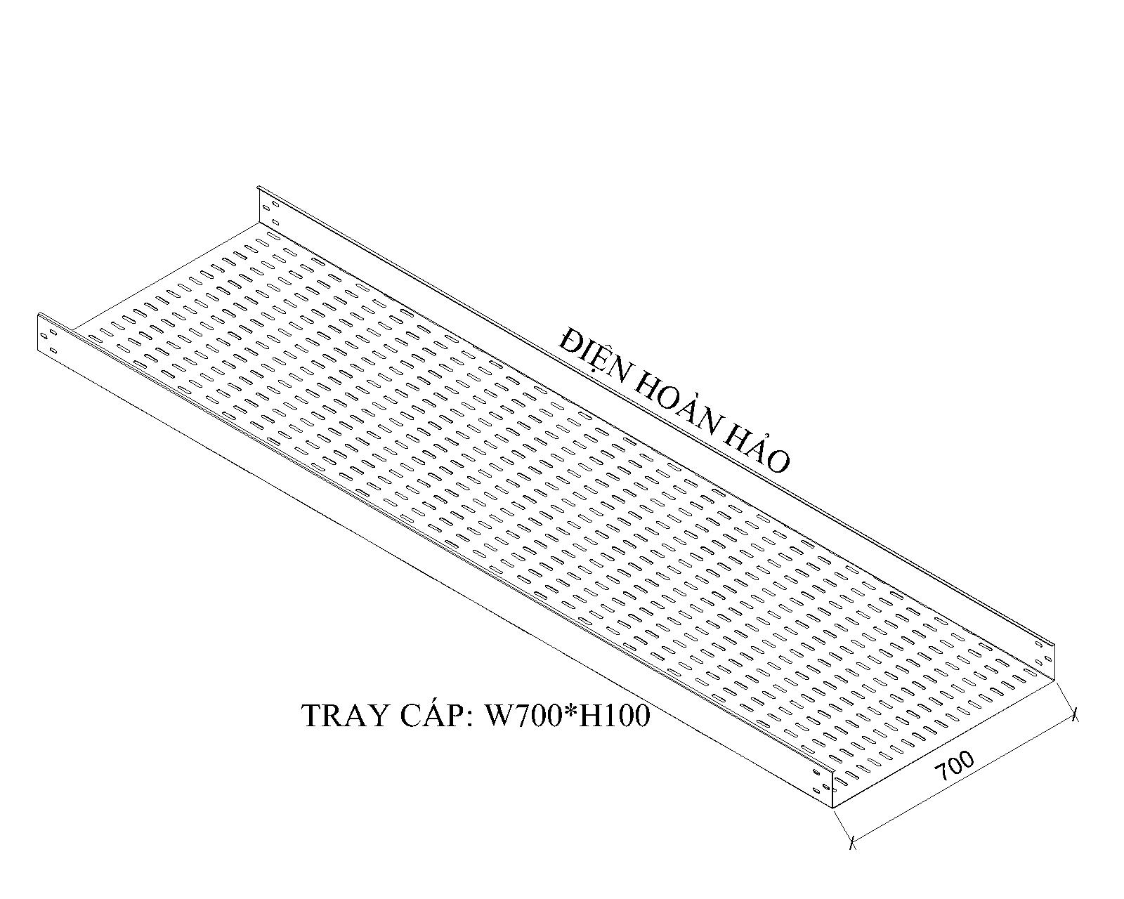 Khay cáp W700*H100 cấu tạo bởi theo hình chữ C, chiều rộng W=700mm và chiều cao H=100mm, sản xuất trên thép tấm được cắt theo kích thước phù hợp, sử dụng máy chấn chuyện dụng chấn vuông góc, sản xuất theo yêu cầu của chủ đầu tư, tư vấn thiết kế hoặc đơn vị thi công, mặt dưới đấy được dập lỗ Ovan giảm tản nhiệt làm mát cáp điện đồng thời hàng lỗ bố trí thẩm mỹ, mặt bên hông được dập lỗ điểm đầu và điểm cuối máng mục đích gắng bát nối và liên kết các cây máng lại với nhau, canh trên máng cạnh chấn thường chấn cạnh 10 đến 12mm dùng tăng cứng cây máng đồng thời gắng nắp máng giữ cố định.