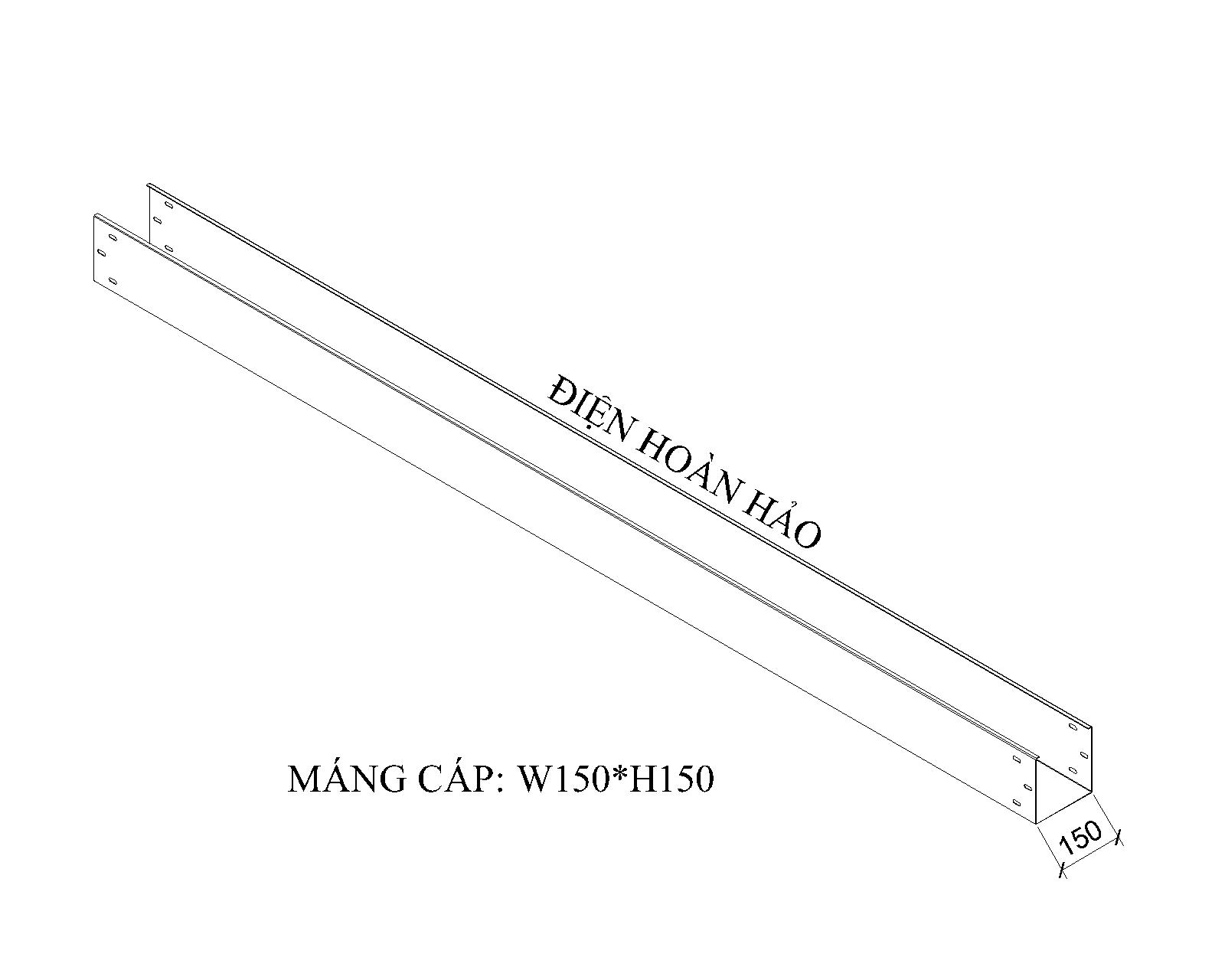 Máng cáp W150*H150 cấu tạo bởi theo hình chữ C, chiều rộng W=150mm và chiều cao H=150mm, sản xuất trên thép tấm được cắt theo kích thước phù hợp, sử dụng máy chấn chuyện dụng chấn vuông góc, sản xuất theo yêu cầu của chủ đầu tư, tư vấn thiết kế hoặc đơn vị thi công, mặt bên hông được dập lỗ điểm đầu và điểm cuối máng mục đích gắng bát nối và liên kết các cây máng lại với nhau, canh trên máng cạnh chấn thường chấn cạnh 10 đến 12mm dùng tăng cứng cây máng đồng thời gắng nắp máng giữ cố định.