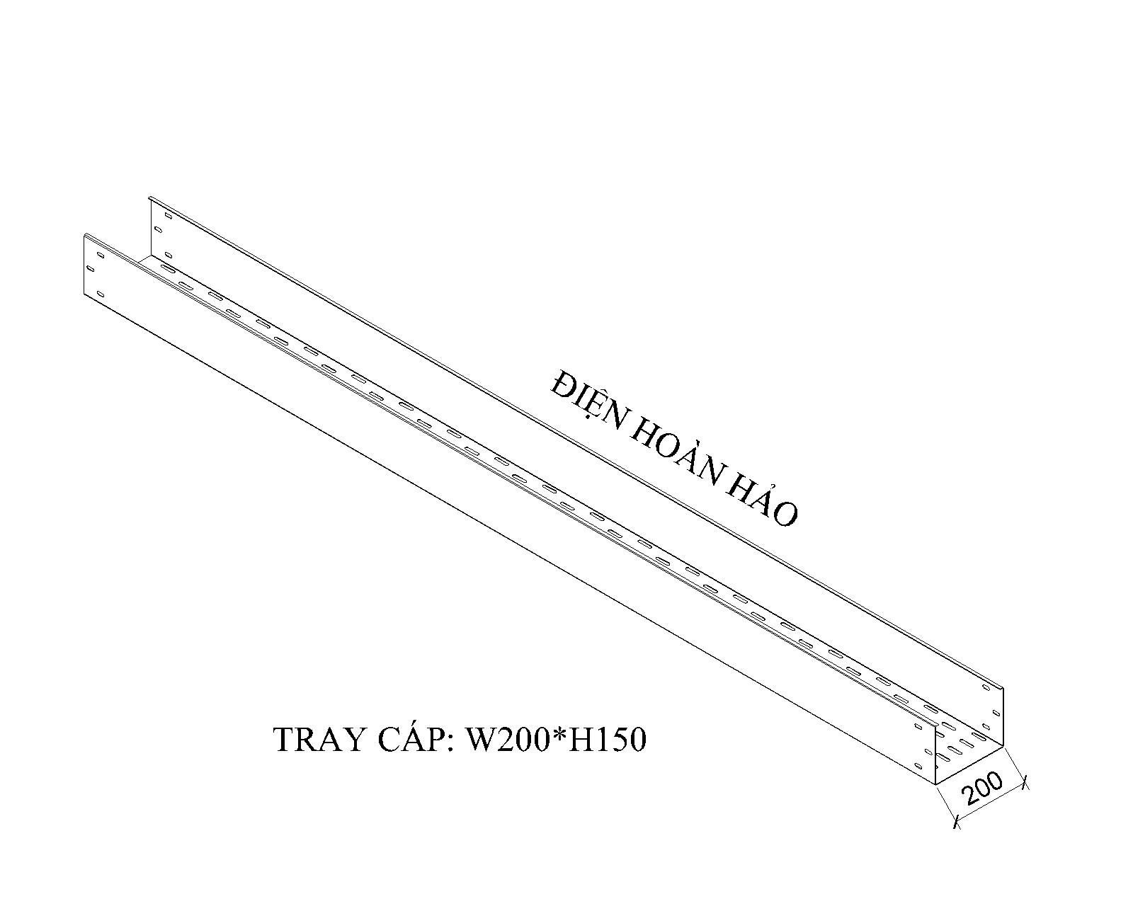 Khay cáp W200*H100 cấu tạo bởi theo hình chữ C, chiều rộng W=200mm và chiều cao H=150mm, sản xuất trên thép tấm được cắt theo kích thước phù hợp, sử dụng máy chấn chuyện dụng chấn vuông góc, sản xuất theo yêu cầu của chủ đầu tư, tư vấn thiết kế hoặc đơn vị thi công, mặt dưới đấy được dập lỗ Ovan giảm tản nhiệt làm mát cáp điện đồng thời hàng lỗ bố trí thẩm mỹ, mặt bên hông được dập lỗ điểm đầu và điểm cuối máng mục đích gắng bát nối và liên kết các cây máng lại với nhau, canh trên máng cạnh chấn thường chấn cạnh 10 đến 12mm dùng tăng cứng cây máng đồng thời gắng nắp máng giữ cố định.