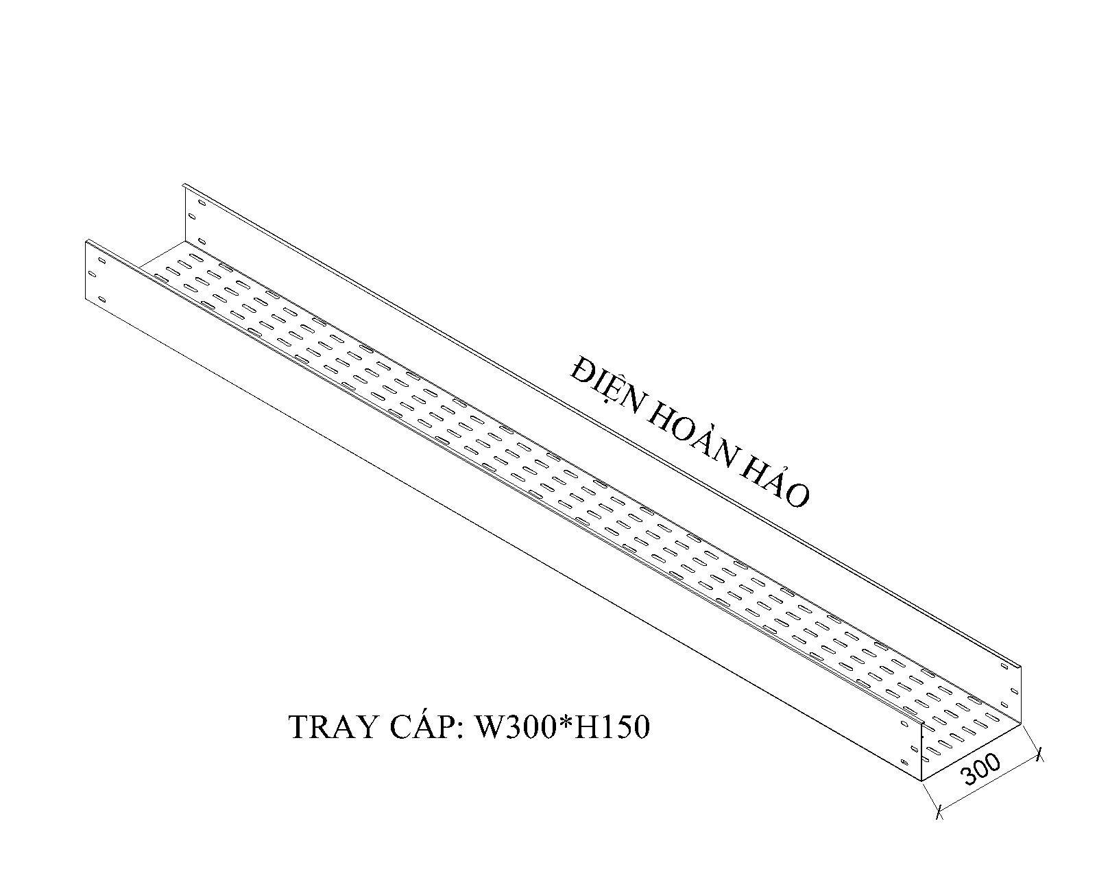 Khay cáp W300*H100 cấu tạo bởi theo hình chữ C, chiều rộng W=300mm và chiều cao H=150mm, sản xuất trên thép tấm được cắt theo kích thước phù hợp, sử dụng máy chấn chuyện dụng chấn vuông góc, sản xuất theo yêu cầu của chủ đầu tư, tư vấn thiết kế hoặc đơn vị thi công, mặt dưới đấy được dập lỗ Ovan giảm tản nhiệt làm mát cáp điện đồng thời hàng lỗ bố trí thẩm mỹ, mặt bên hông được dập lỗ điểm đầu và điểm cuối máng mục đích gắng bát nối và liên kết các cây máng lại với nhau, canh trên máng cạnh chấn thường chấn cạnh 10 đến 12mm dùng tăng cứng cây máng đồng thời gắng nắp máng giữ cố định.