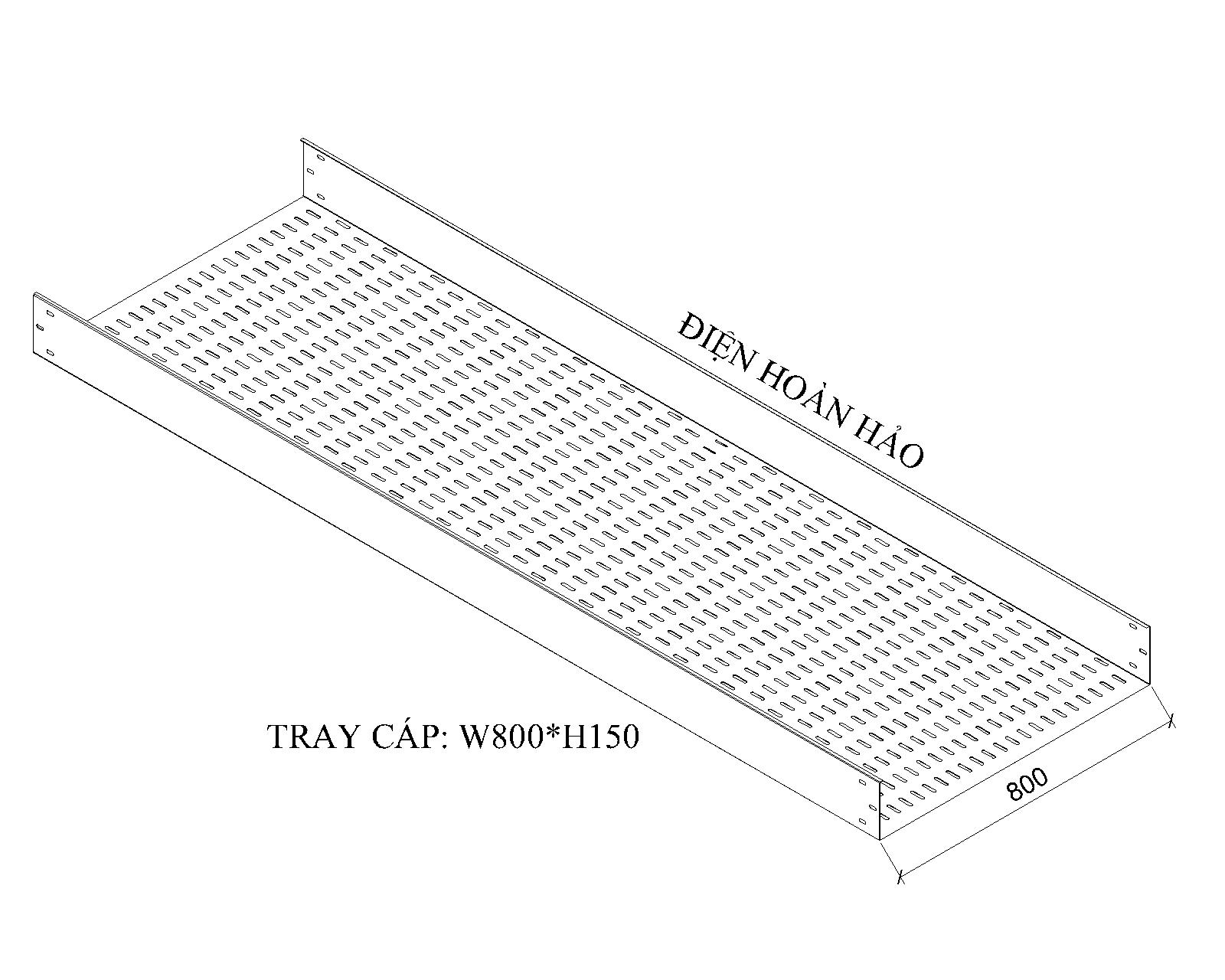Khay cáp W800*H100 cấu tạo bởi theo hình chữ C, chiều rộng W=W800mm và chiều cao H=150mm, sản xuất trên thép tấm được cắt theo kích thước phù hợp, sử dụng máy chấn chuyện dụng chấn vuông góc, sản xuất theo yêu cầu của chủ đầu tư, tư vấn thiết kế hoặc đơn vị thi công, mặt dưới đấy được dập lỗ Ovan giảm tản nhiệt làm mát cáp điện đồng thời hàng lỗ bố trí thẩm mỹ, mặt bên hông được dập lỗ điểm đầu và điểm cuối máng mục đích gắng bát nối và liên kết các cây máng lại với nhau, canh trên máng cạnh chấn thường chấn cạnh 10 đến 12mm dùng tăng cứng cây máng đồng thời gắng nắp máng giữ cố định.